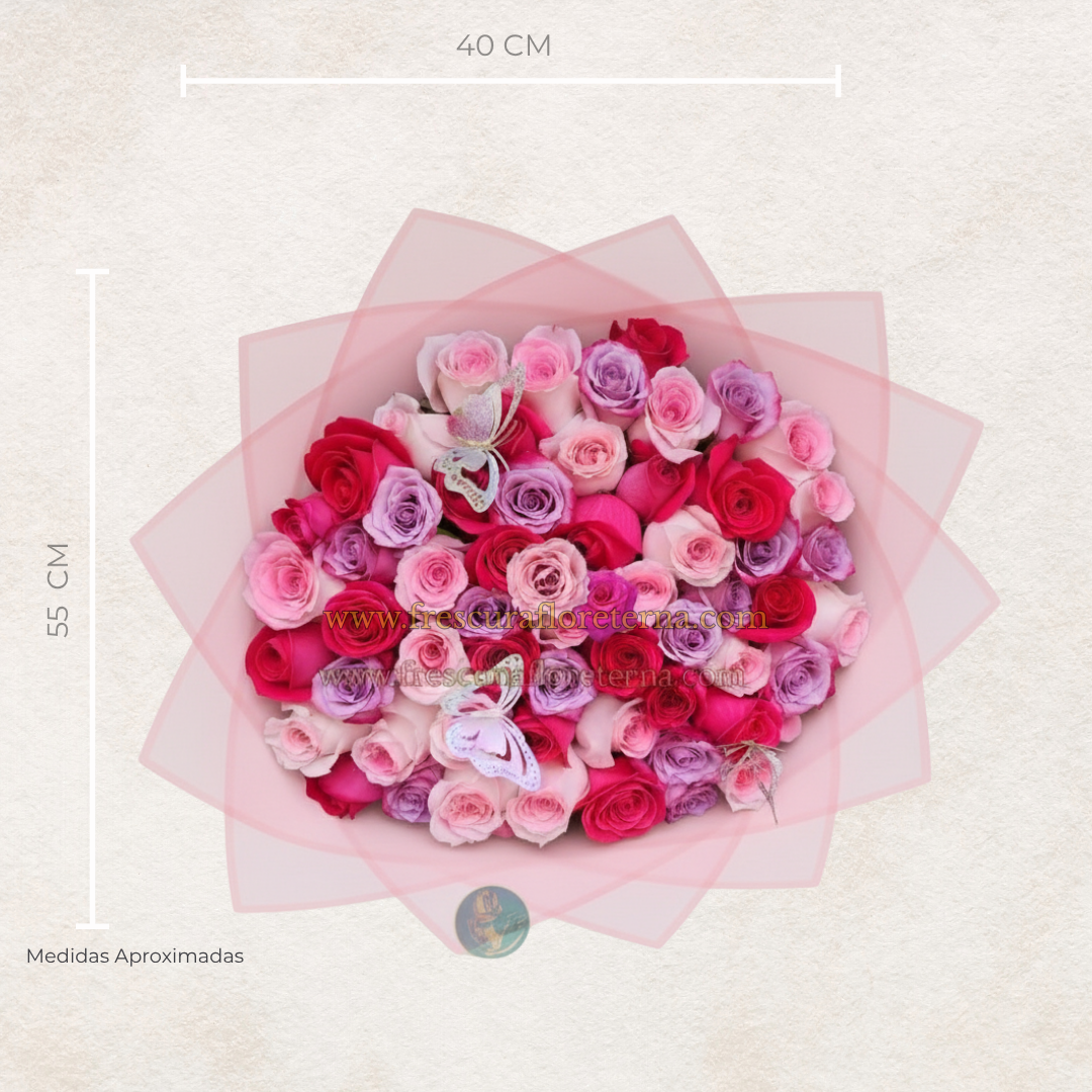 - A vibrant 60 rose bouquet with a mix of roses in various colours.