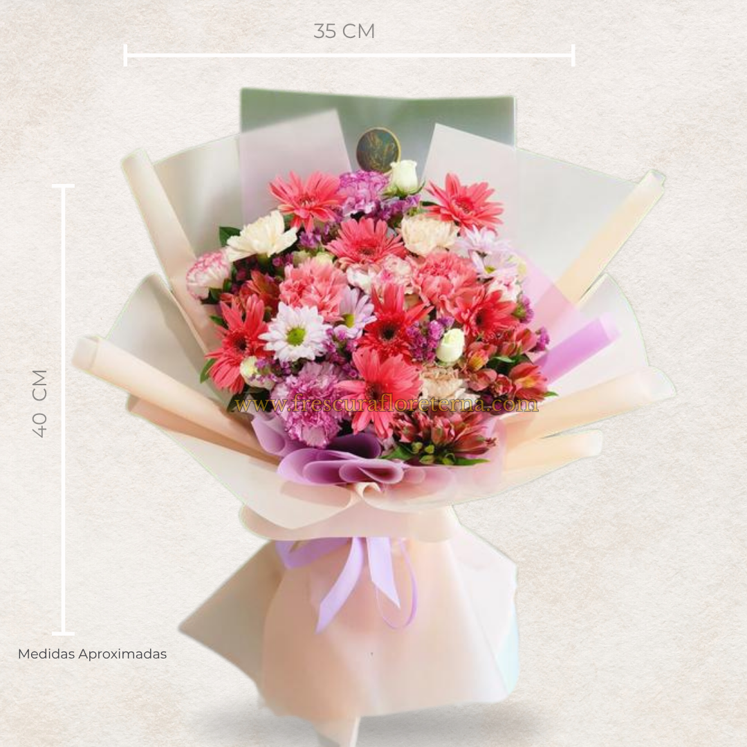 Inspirado en la luz del amanecer, este diseño floral se presenta en estilo bouquet envolvente con flores frescas y variadas. Cada tamaño está diseñado para transmitir emociones únicas, desde un detalle delicado hasta una expresión imponente de cariño y celebración.