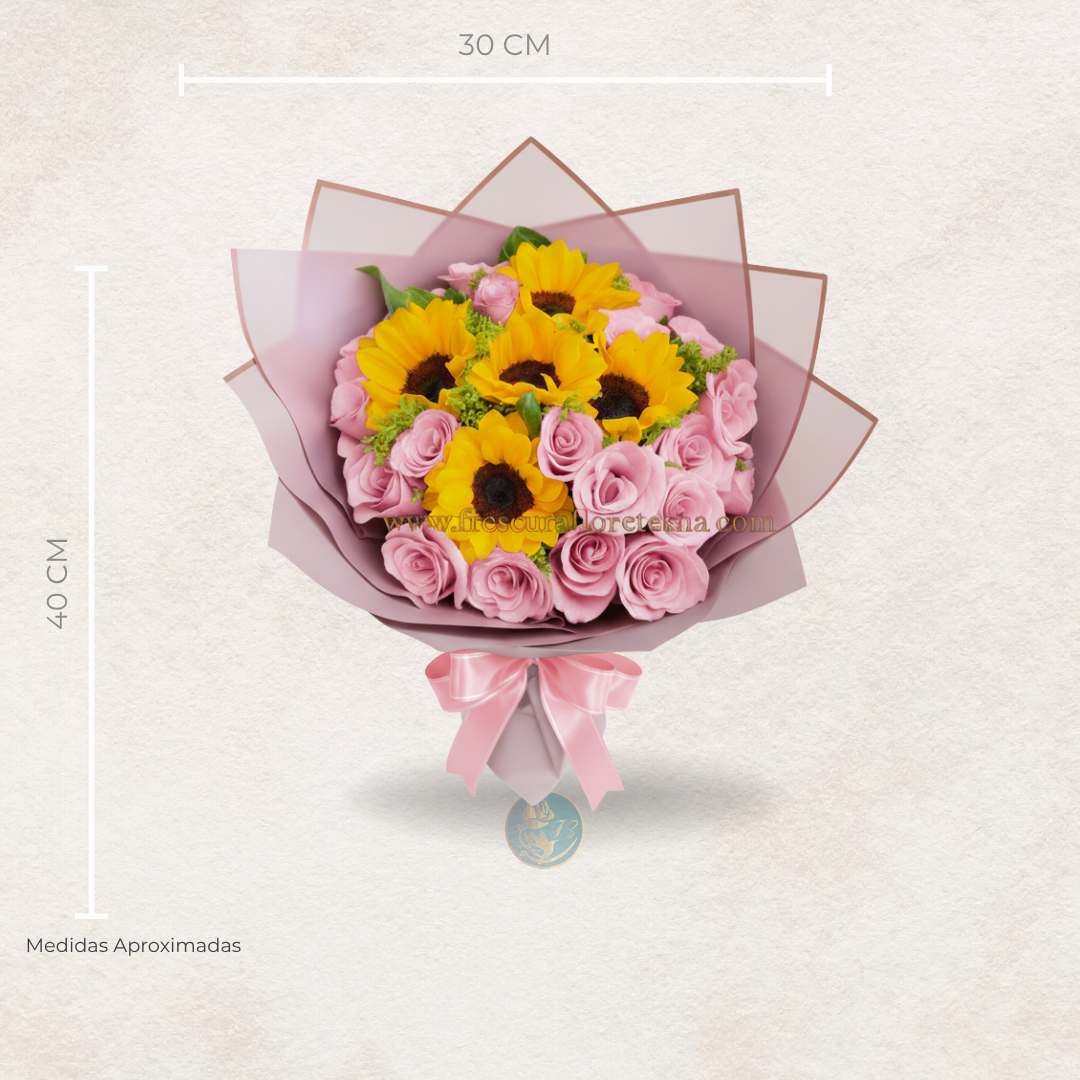 Un diseño floral que celebra la armonía entre la calidez del girasol y la elegancia atemporal de la rosa. Esta creación está pensada para iluminar momentos especiales con un aura de distinción, ternura y estilo.