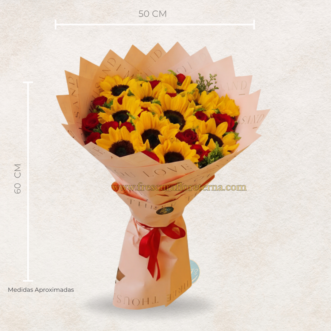 Un diseño floral que celebra la armonía entre la calidez del girasol y la elegancia atemporal de la rosa. Esta creación está pensada para iluminar momentos especiales con un aura de distinción, ternura y estilo.
