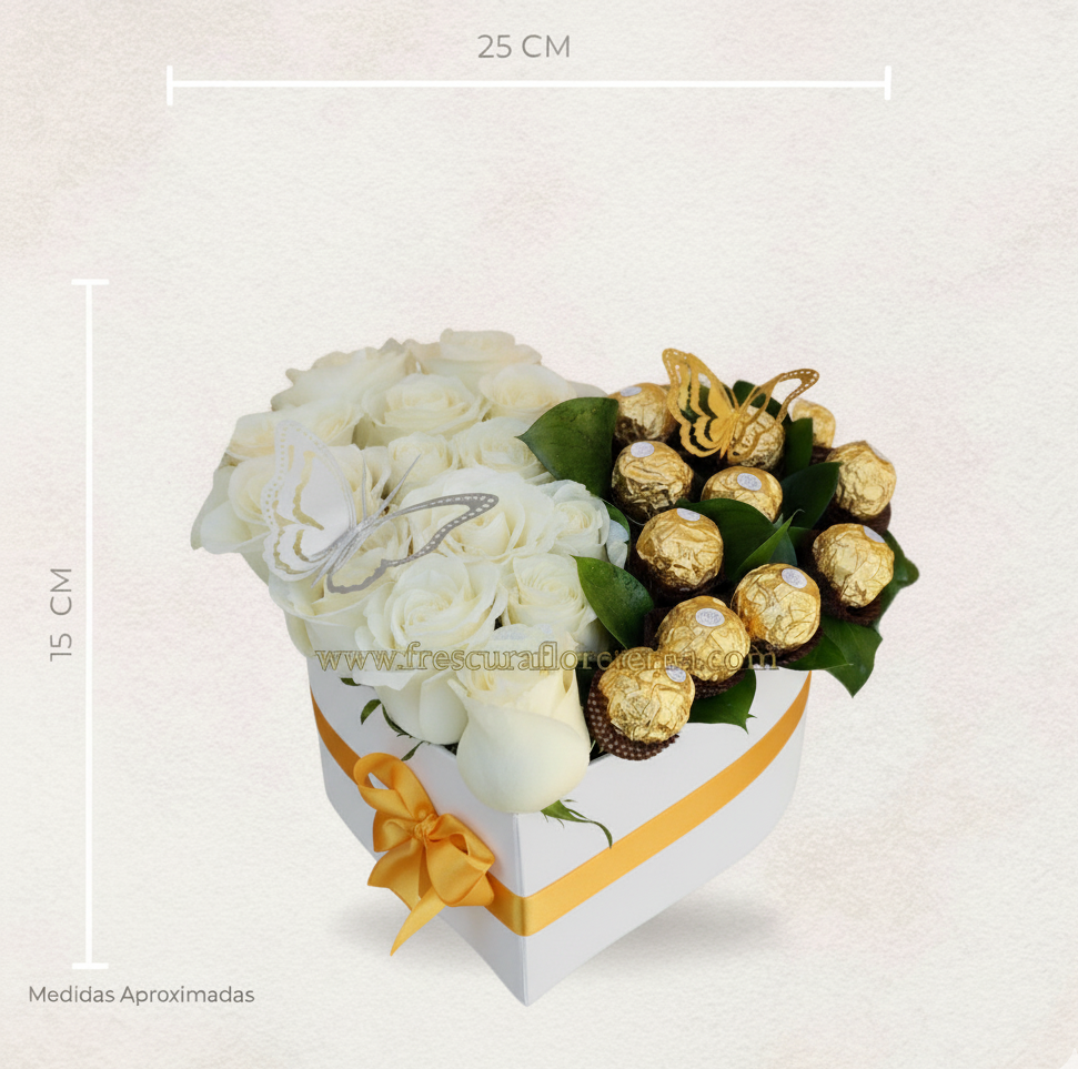 Una elegante caja con forma de corazón que fusiona la pasión de las rosas rojas con la dulzura del chocolate. Diseñada para impresionar en fechas especiales como aniversarios, cumpleaños o momentos en los que el amor necesita hablar más alto.