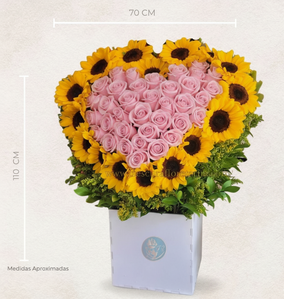 - Incluye: 15 girasoles brillantes y 50 rosas frescas en un diseño de corazón flotante.